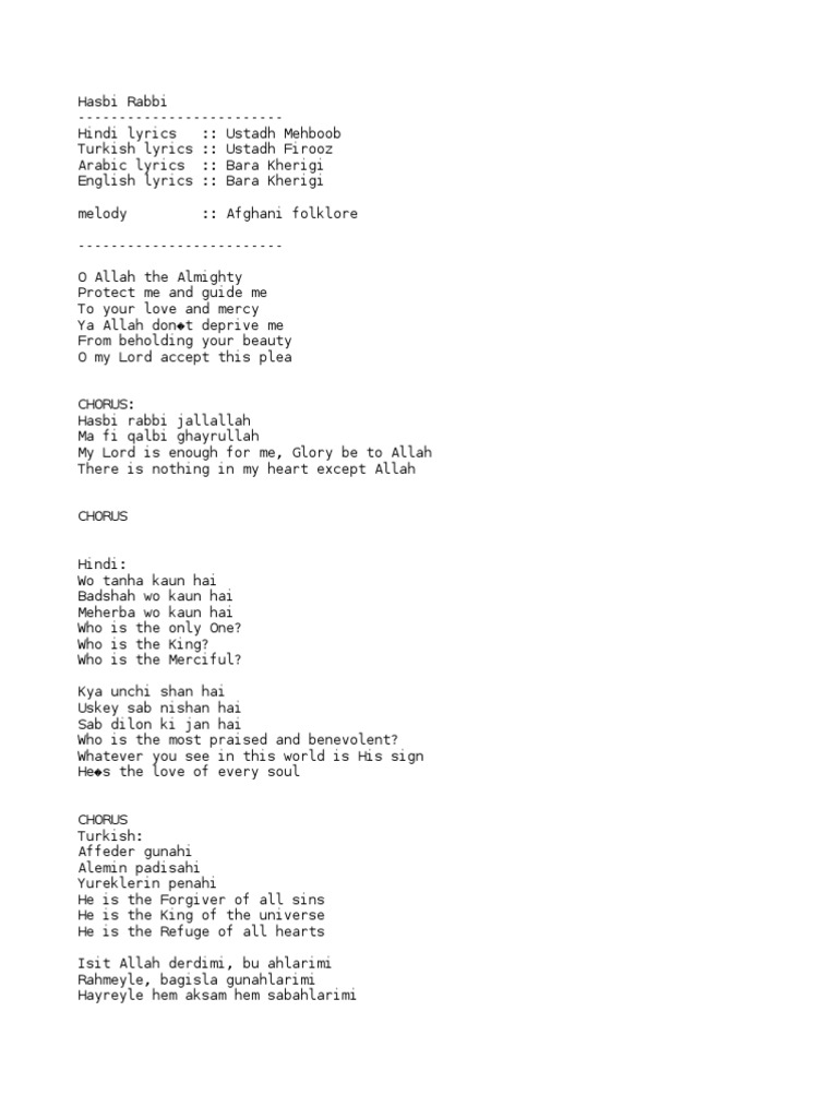 Hasbi Rabbi English Naat Lyrics : Hasbi rabbi jallallah ma fi qalbi ghayrullah my lord is enough for me, glory be to allah there is nothing in my heart except allah.